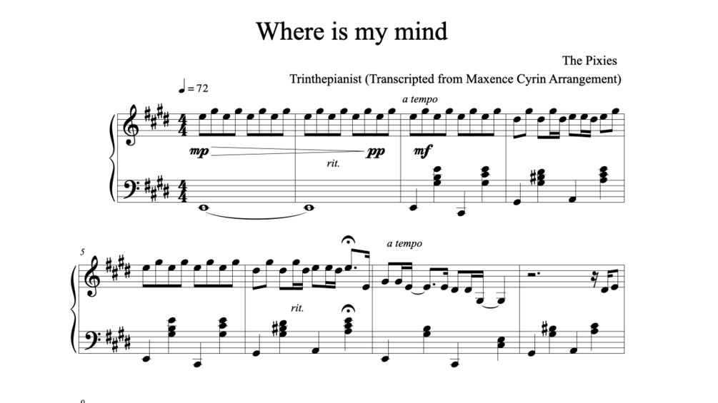 Partitura del tema "where is my mind" de Pixies, transcrita por Trinthepianist
