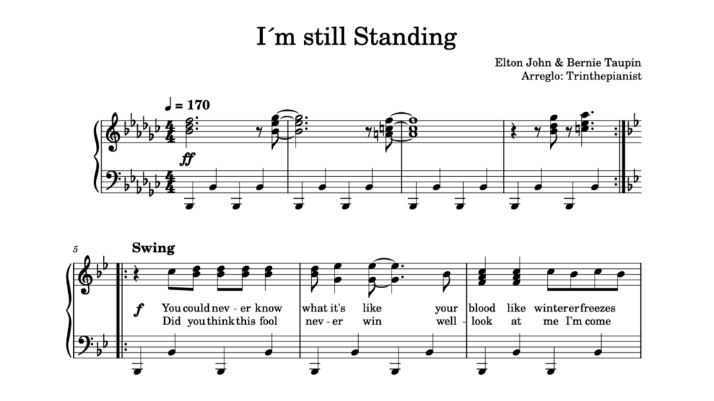 Partitura del arreglo de "Im still standing" de Elton John de Trinthepianist.