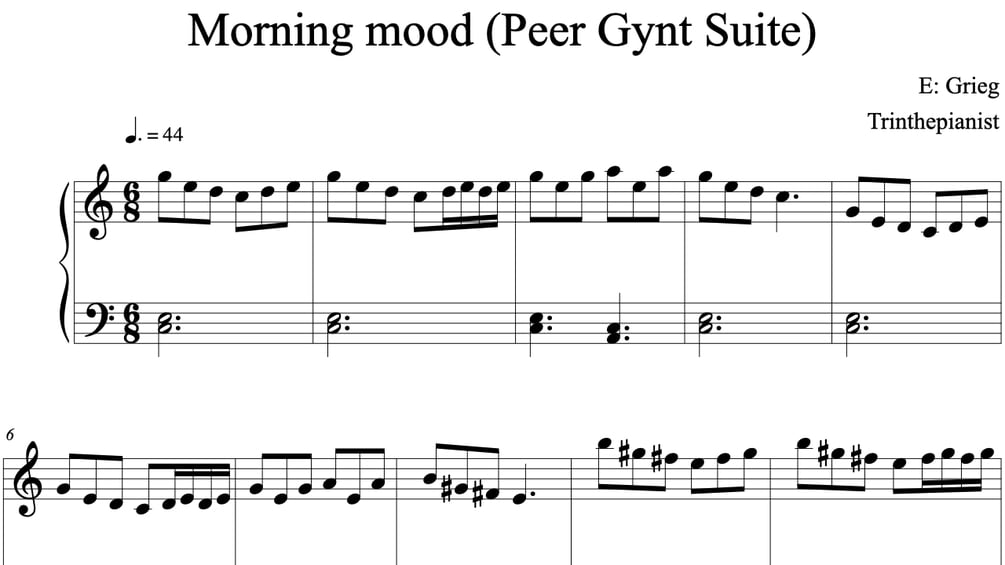 Partitura de la pieza "Morning mood" de Edvard Grieg, de la famosa suite "Peer Gynt", en un arreglo muy fácil de Trinthepianist.