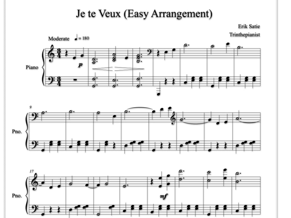 Arreglo exclusivo de Trinthepianist sobre la obra "Je te veux" de Erik Satie, que la facilita con respecto a la obra original y mantiene su belleza y esencia.